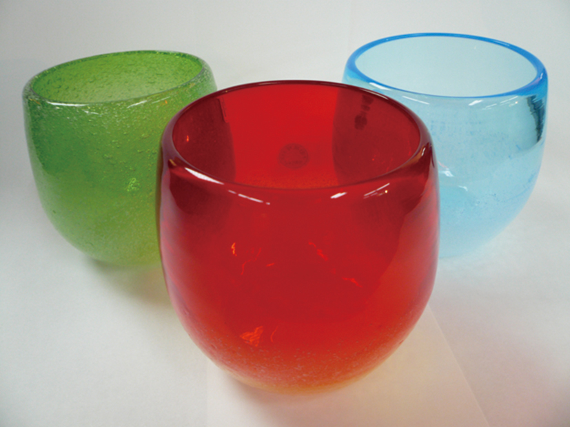 太平洋戦争時に米軍が残した廃瓶を利用して作ったグラスを指すのじゃ。気泡が混じっているのが特徴じゃが、これは廃瓶に含まれる不純物の影響のようじゃ(飲用時には、人体に何ら影響はないぞよ)。青、赤、緑などの鮮やかな色合いは、まさに南国沖縄イメージにピッタリじゃのぉ~。泡盛をオンザロックや水割りで飲む際によく使われるぞよ。